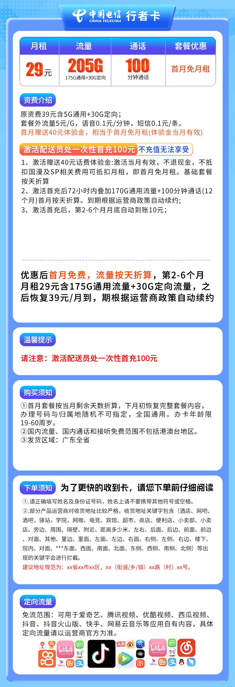 每月享:175G通用流量 + 30G专用流量 + 100分钟免费通话