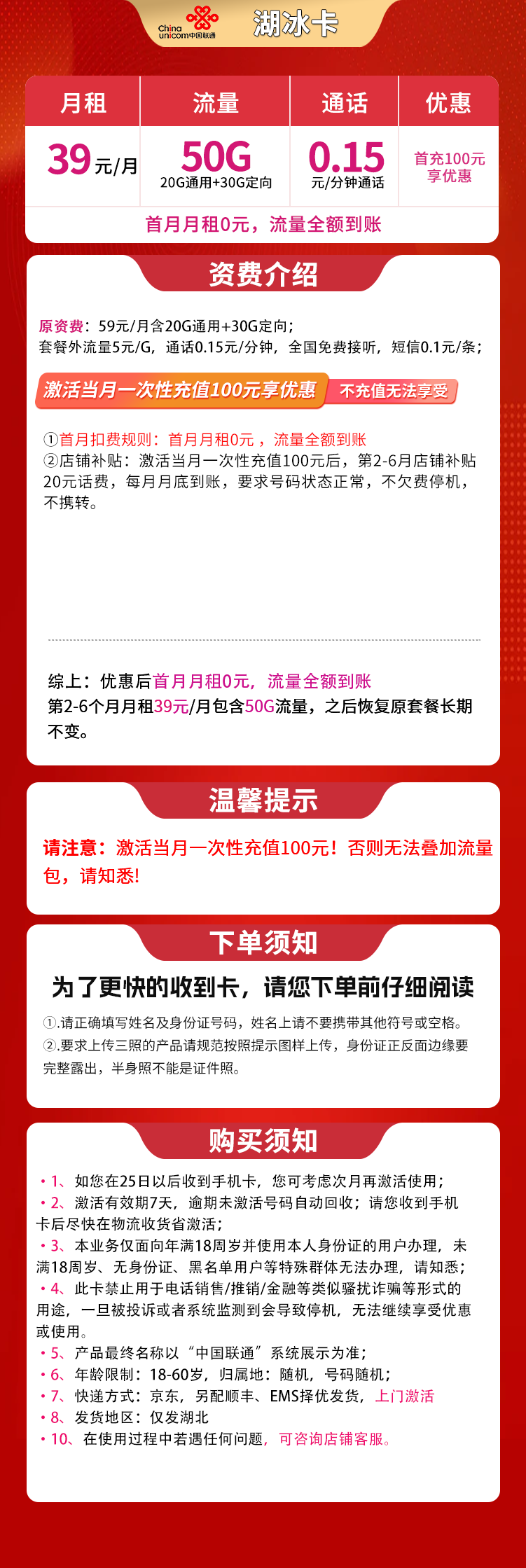 激活当月任意渠道充值100元