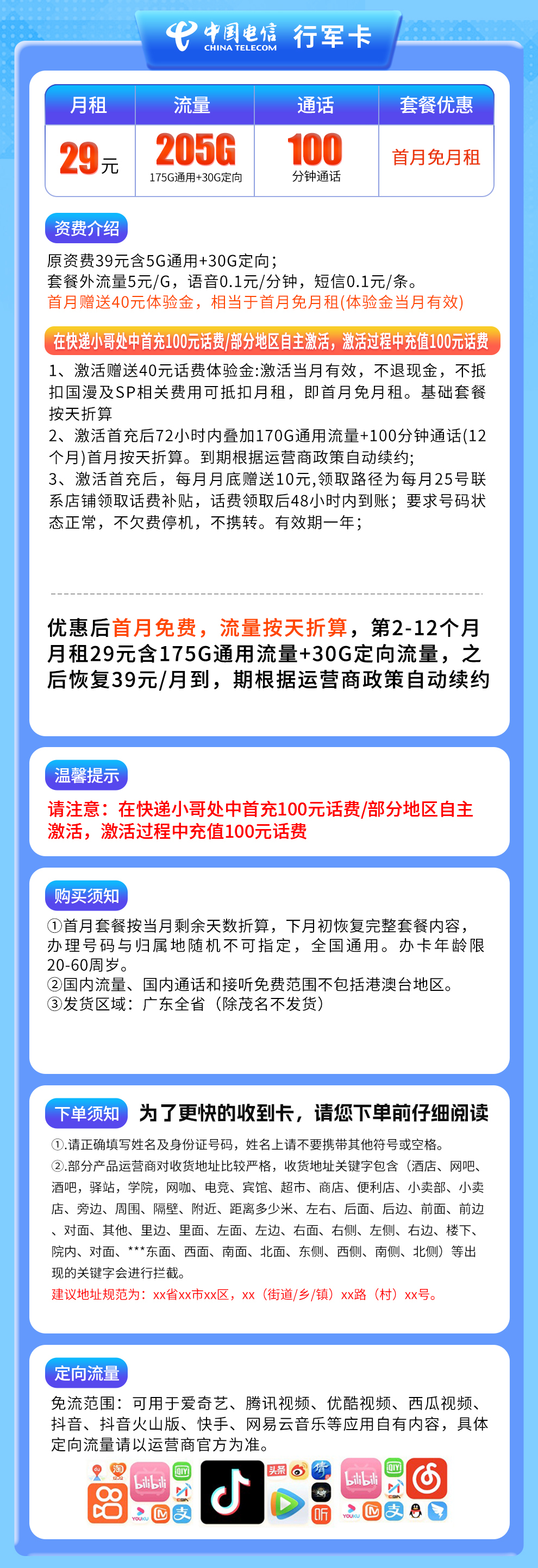 每月享:175G通用流量 + 30G专用流量 + 100分钟免费通话