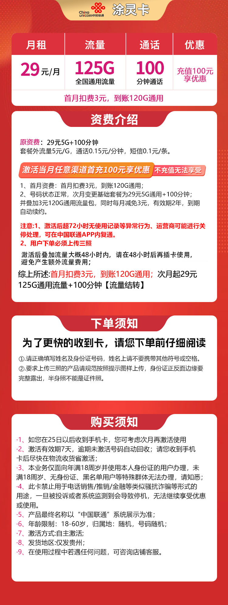 每月享:125G通用流量 + + 100分钟免费通话