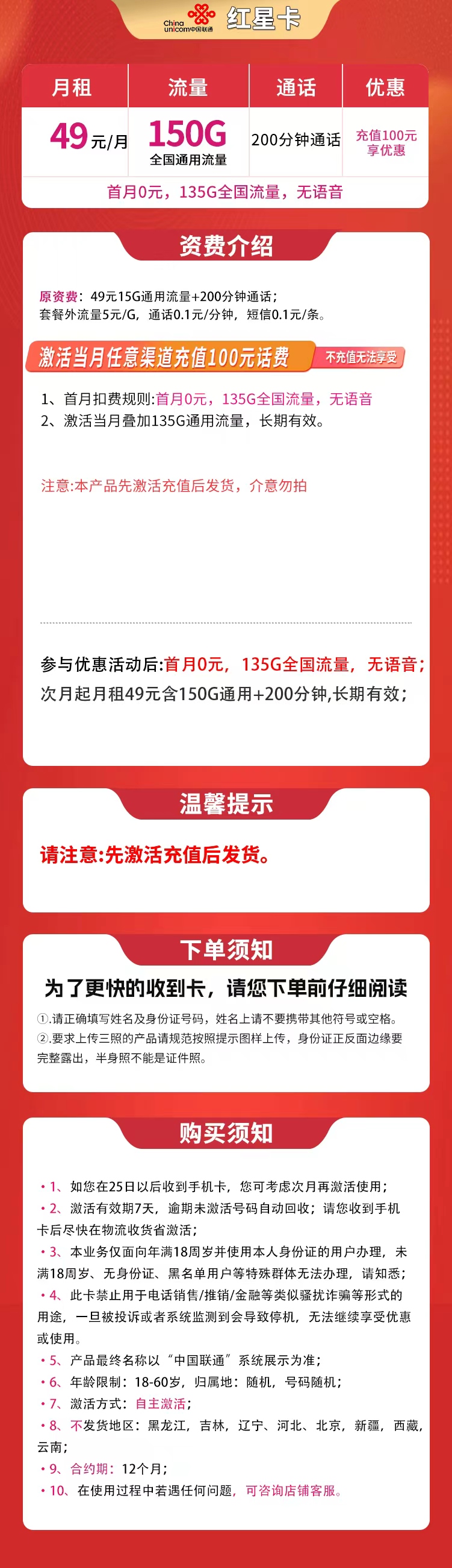 激活当月任意渠道充值100元享受优惠