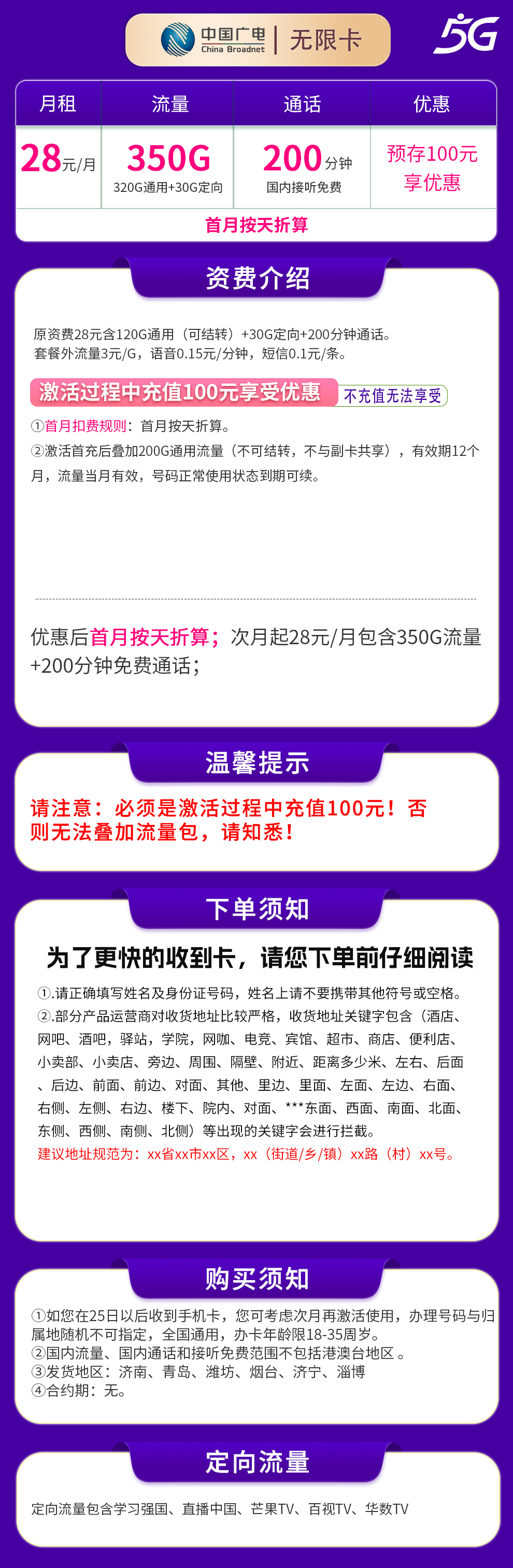 每月享:320G通用流量 + 30G专用流量 + 200分钟免费通话