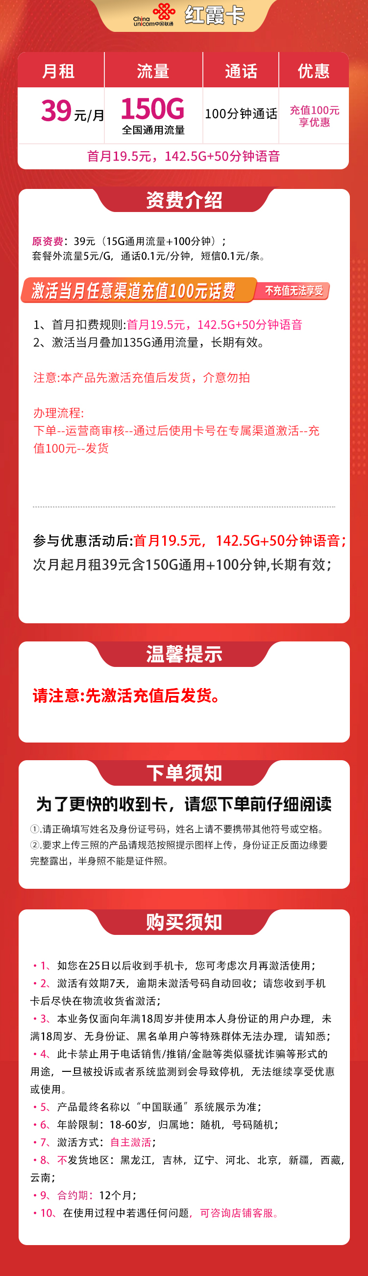 每月享:150G通用流量 + + 100分钟免费通话