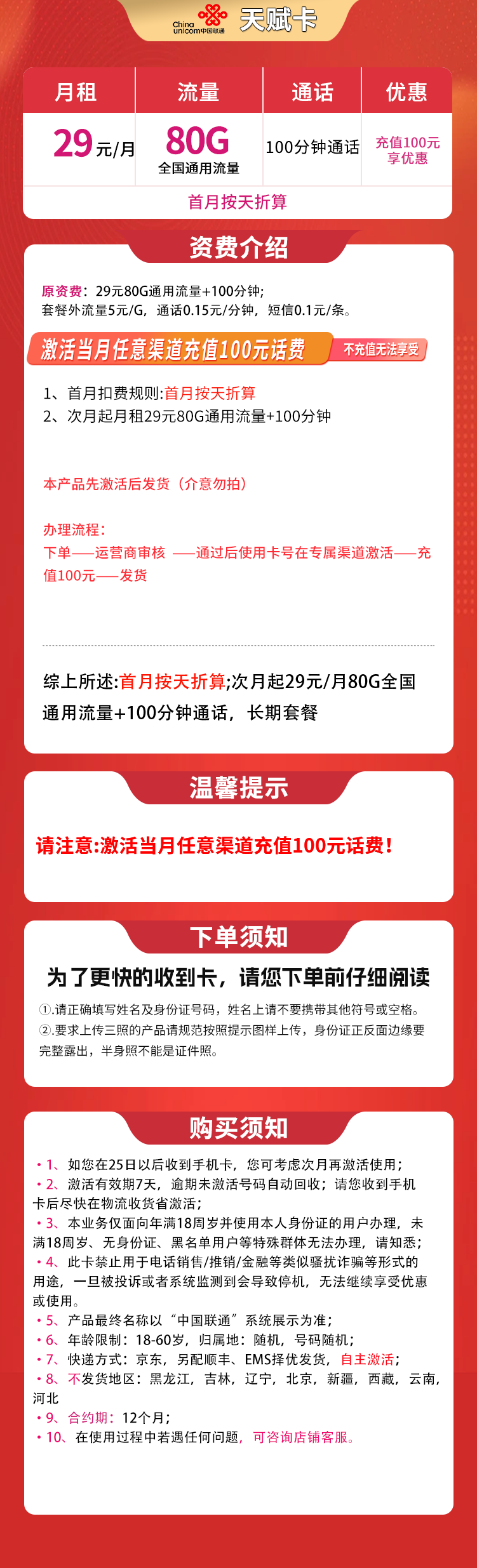 激活当月任意渠道充值100元