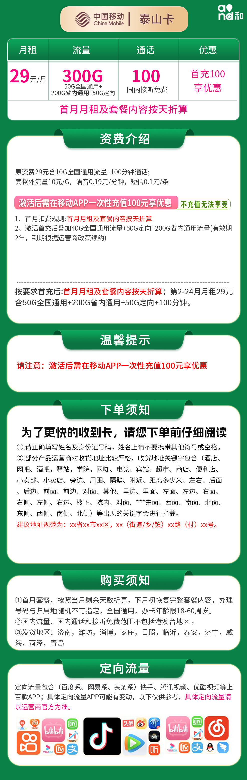 每月享:250G通用流量 + 50G专用流量 + 100分钟免费通话