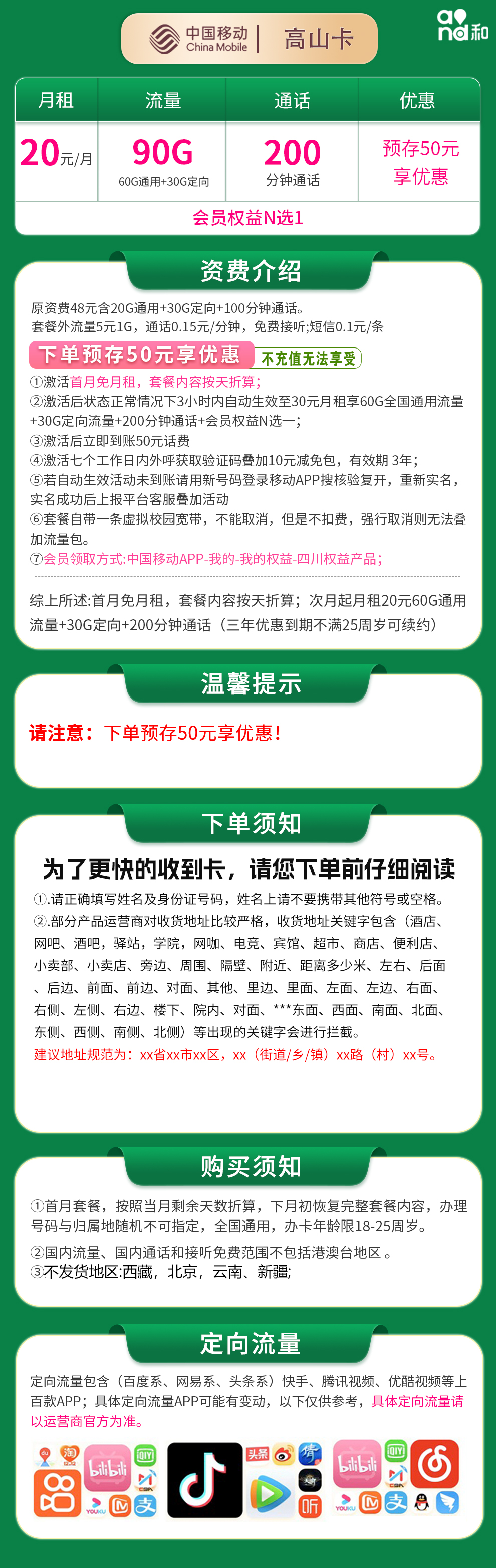 每月享:60G通用流量 + 30G专用流量 + 200分钟免费通话